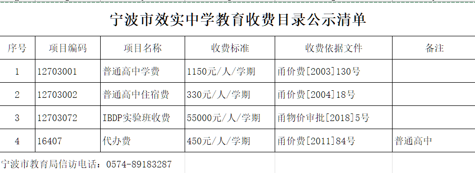 宁波市效实中学教育收费目录公示清单2026