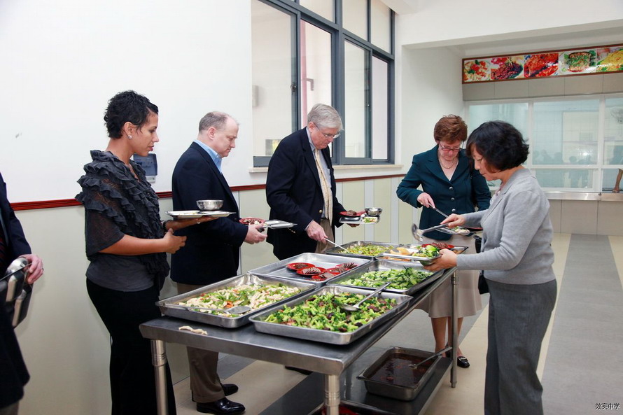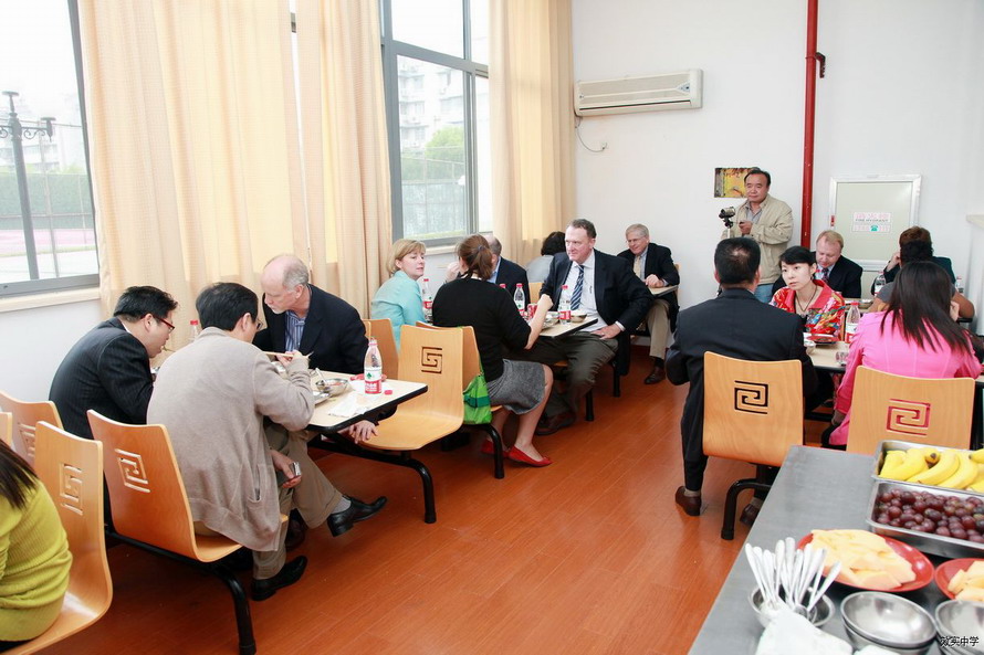 访问团深入我校学生食堂并一起体验中国学校的午餐。在接受我校学生的采访后,来宾们对我校学生的英语能力和大方得体的举止赞不绝口。