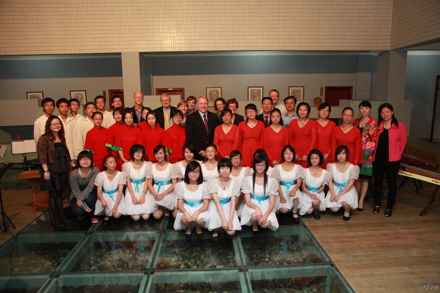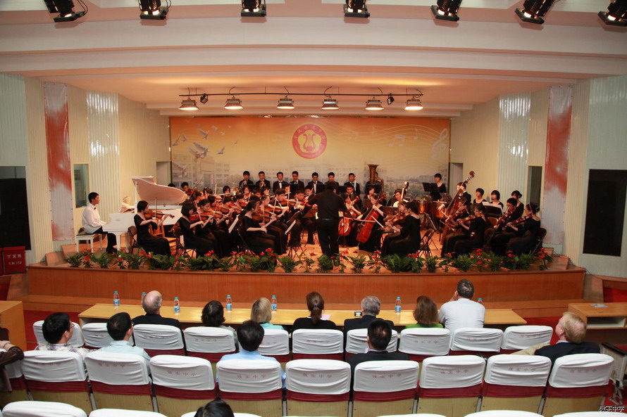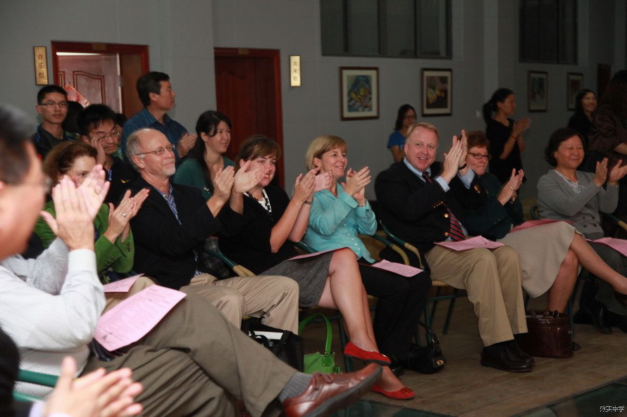 我校还为远道而来的客人奉上了一场视觉与听觉的盛宴。我校的管弦乐团、民乐队和合唱队分别演出了《费加罗的婚礼序曲》、钢琴协奏曲《黄河》、小提琴协奏曲《梁祝》、《茉莉花》、《彝族舞曲》等经典曲目。表演结束,来宾们纷纷向周校长祝贺,连呼:“Xiaoshi is a great school!”