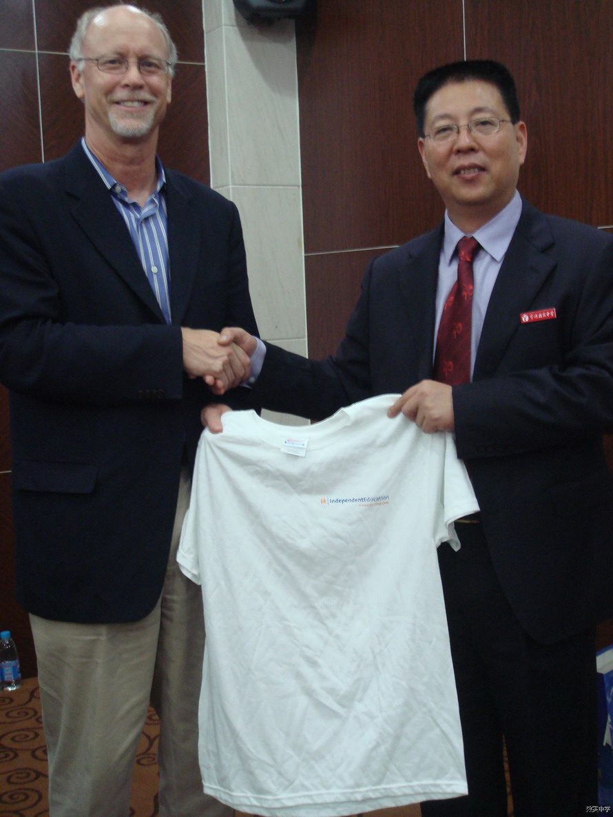 Mr.Thomas Toch 向周千红校长赠送印有“Independent Education (私立教育)”字样的文化衫
