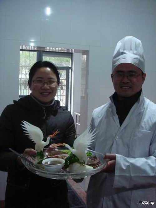 语文组老师不愧浪漫,菜名特有诗情画意 —— 听!“东海游龙”,“鱼翔浅底”,不光诗意,菜还能让人觉出动感来。其实,其他组也不逊色,数学组和综合组呈送的分别是“玉兔迎新”,“月湖春色”。新年早早祝了,春色也揽尽了,好气派!还有几道菜,为避嫌,怕泄露个人信息,都做了处理,如本有招牌式效应的“夏氏红烧肉”成了庸常的“红烧肉”,口味却非同一般,原料还是去松阳支教时带来的正宗家猪肉!有着八大菜系之一 —— 淮扬菜精髓的“扬州酱排骨”也低调为“茄汁排骨”。而最后独占鳌头的是外语组的三人合作 —— “双鹤醉牛排”,以巧妙的创意、精致的造型,还有主辅料合理搭配,色调口味精当等技压全场,尤其是红白萝卜雕刻而成的双鹤栩栩如生地纤立于其间,令全场叫绝,而参赛选手也荣获了“效实厨神”的美名。