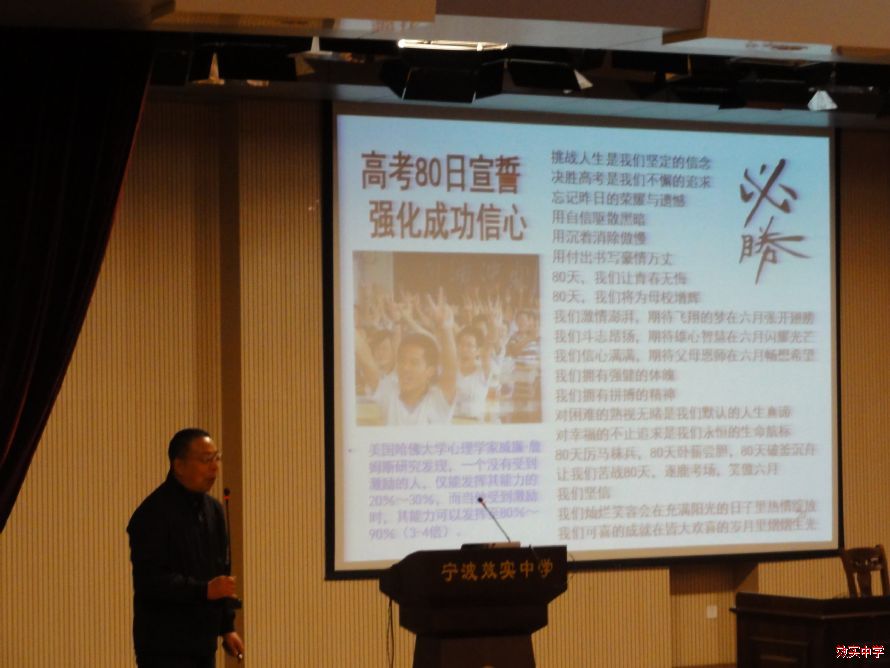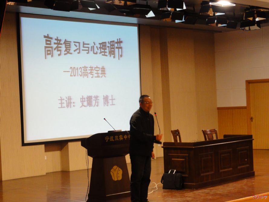 3月13日下午,宁波教科所心理研究室主任史耀芳博士来到效实中学,向全体高三学生作了题为《高考复习与心理调节》的讲座。史博士自1995年开始研究高考心理问题,在高考心理调适方面很有经验。