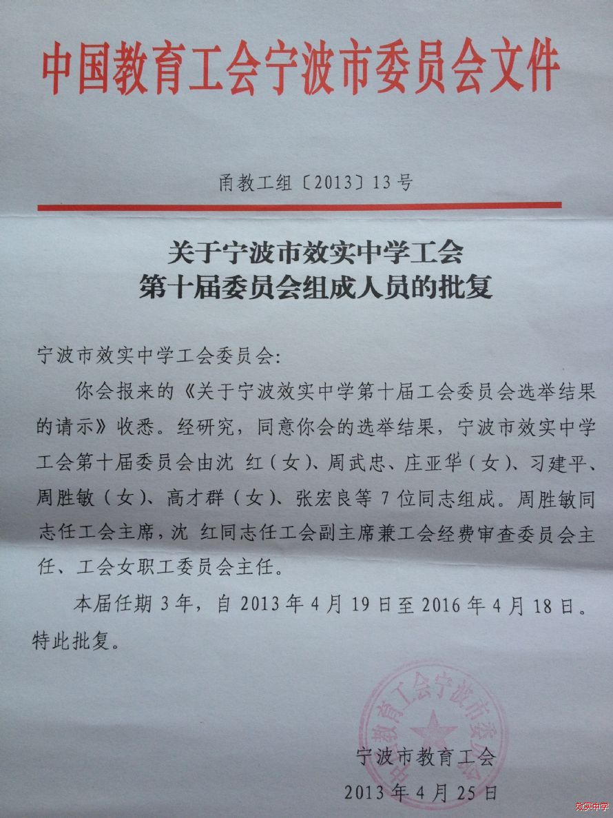宁波市教育工会关于宁波市效实中学工会第十届委员会组成人员的批复