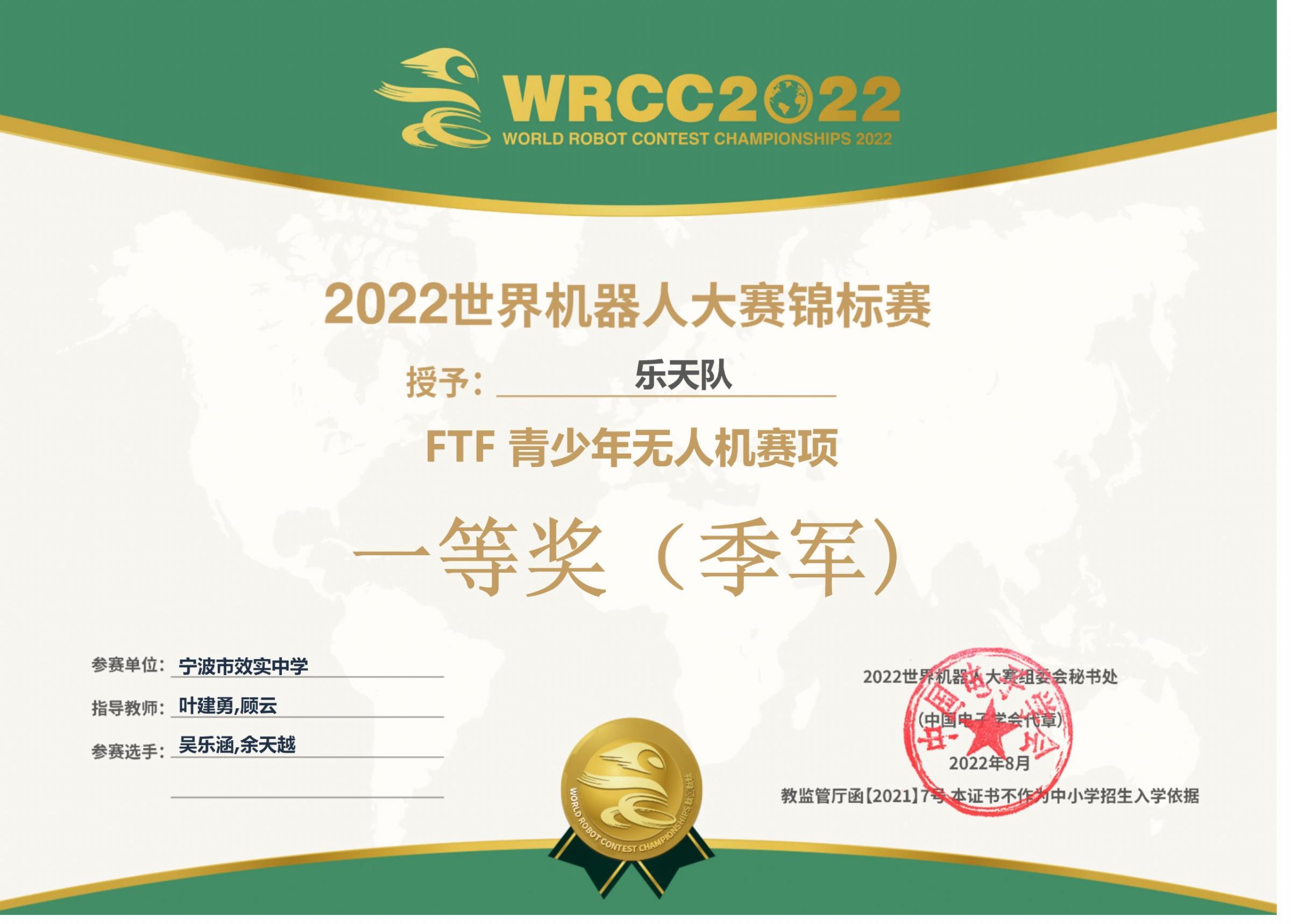 2022世界机器人大赛锦标赛在八月的尾声中于北京落幕。我校B2504吴乐涵同学作为宁波“乐天...