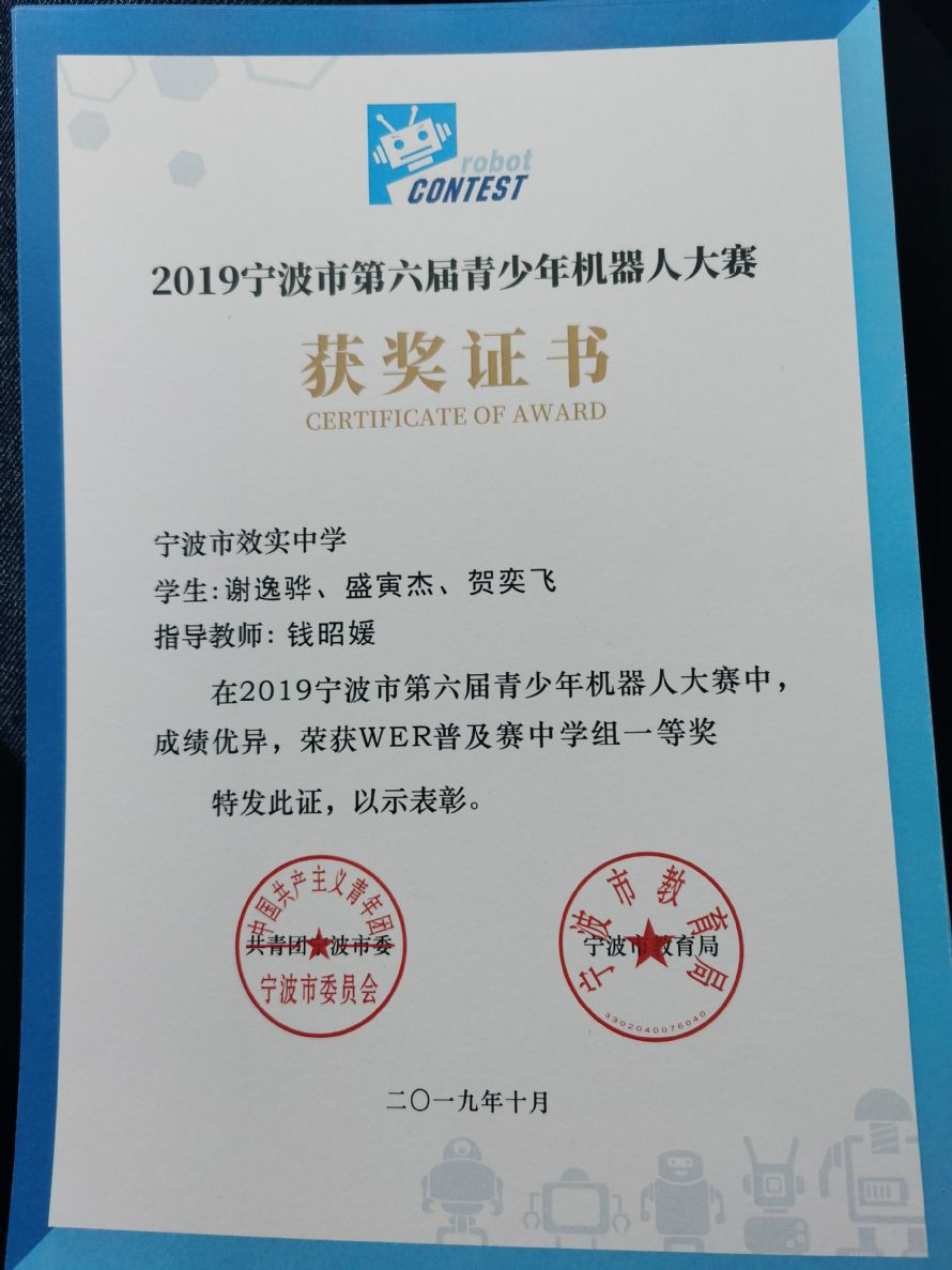 我校学子喜获宁波市青少年机器人大赛WER普及赛一等奖