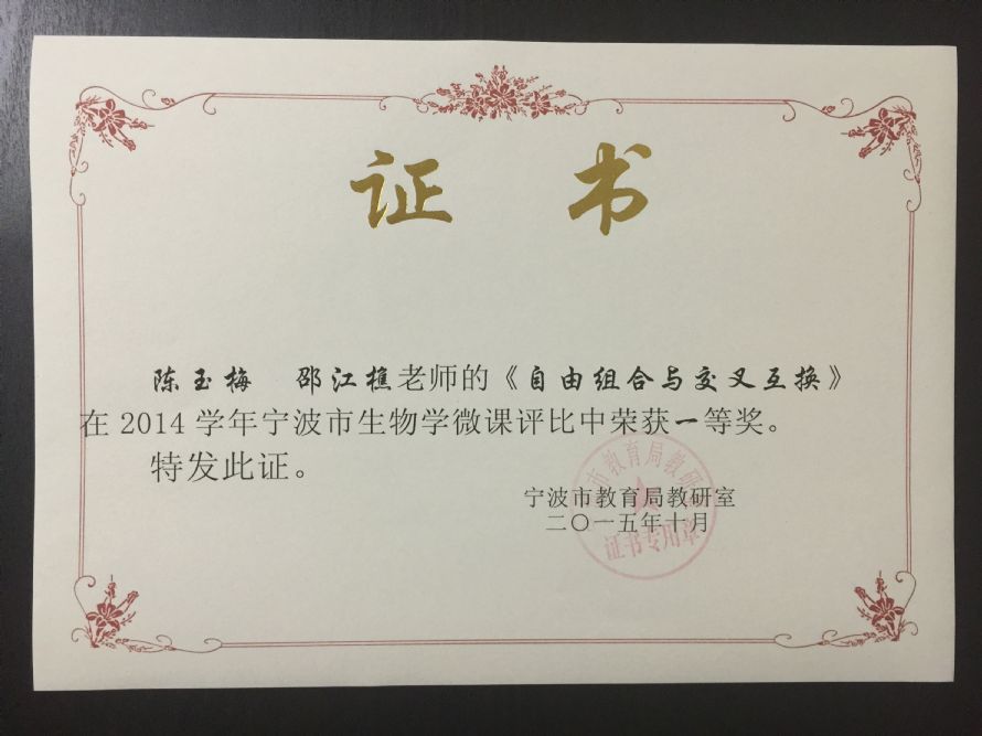 陈玉梅老师的微课荣获宁波市一等奖