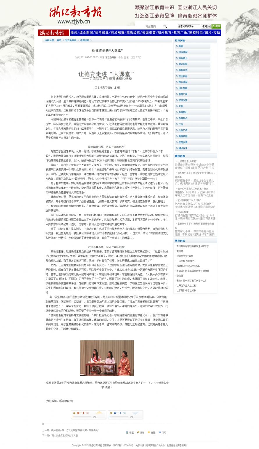 浙江教育报刊登《让德育走进“大课堂”》一文报道我校德育课程化情况