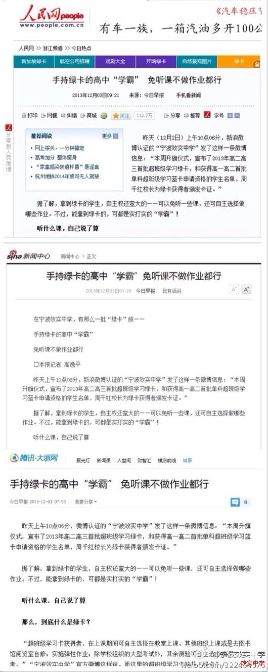 我校超班级学习(绿卡)制度受到媒体高度关注。今天,《今日早报》发布《手持绿卡的高中“学霸”免听课不做作业都行》一文,...