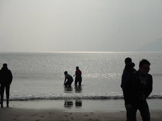 冬季的南沙海滩没有游客,却迎来了一批小测量员。学生按各自的兴趣,分成观察海滩形态、收集海滩沉积物、测量海浪力度、观测海沙堆积四个小组。因为要在沙滩和浅水中行走,大多数学生换上了雨靴,有两个男生准备得相当充分,还穿上了渔民专用的防水服。每个人都不惧寒冷和凛冽的海风,专心完成自己的任务。有的测风向,有的用长长的皮尺测量海滩长度和宽度,有的把量杯嵌入沙中测量水位,有的用不同型号的沙筛筛选沉积物。在完成相关测量后,大家吃了点面包、饼干当午饭,收拾好垃圾,然后前往下一个地点。