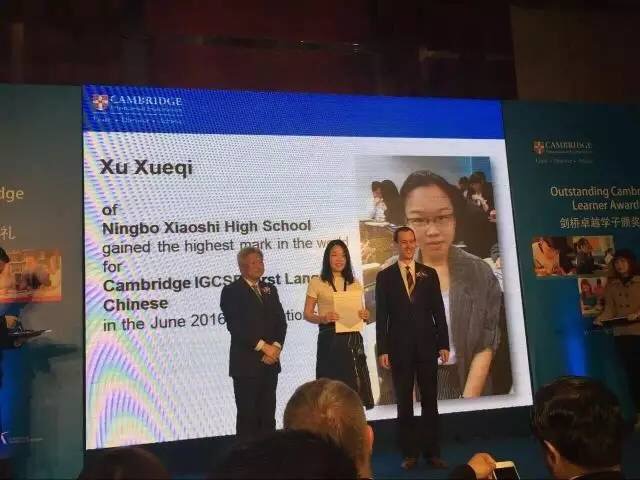 此次颁奖典礼旨在表彰和鼓励世界各地的学生在剑桥考试中所取得的优异成绩。 中国区获此殊荣的54名学生来自不同的省份,在不同的学科上获得了全球最高分。宁波效实中学的徐雪琪荣幸地成为了他们中的一员,取得了2016年度剑桥考试中文学科全球第一的好成绩(Top in the World),也是宁波地区唯一获此殊荣的学生。”