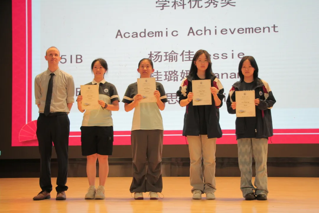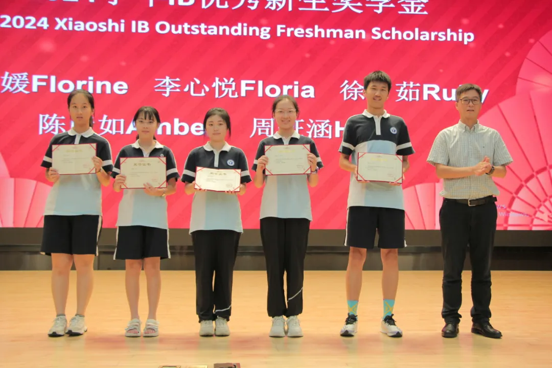 国际中心为表彰学生学术成就、激励学生追求卓越,设立了一系列奖项和奖学金。在这一教育方针的指导下,效实中学黄琪锋副校长为国际中心的五位高一新生颁发了2024学年度IB优秀新生奖学金。这五位获奖学生分别是闫甬媛、李心悦、徐夕茹、陈彦如和周钲涵。