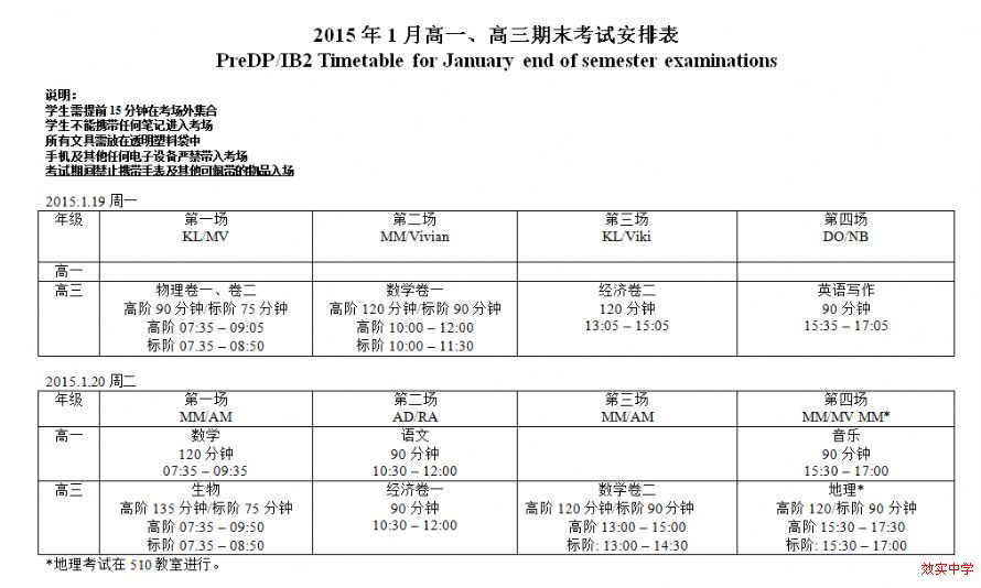 国际中心高二期末考试安排