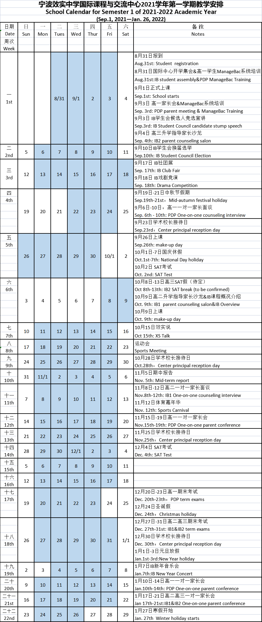 2021—2022学年第一学期校历