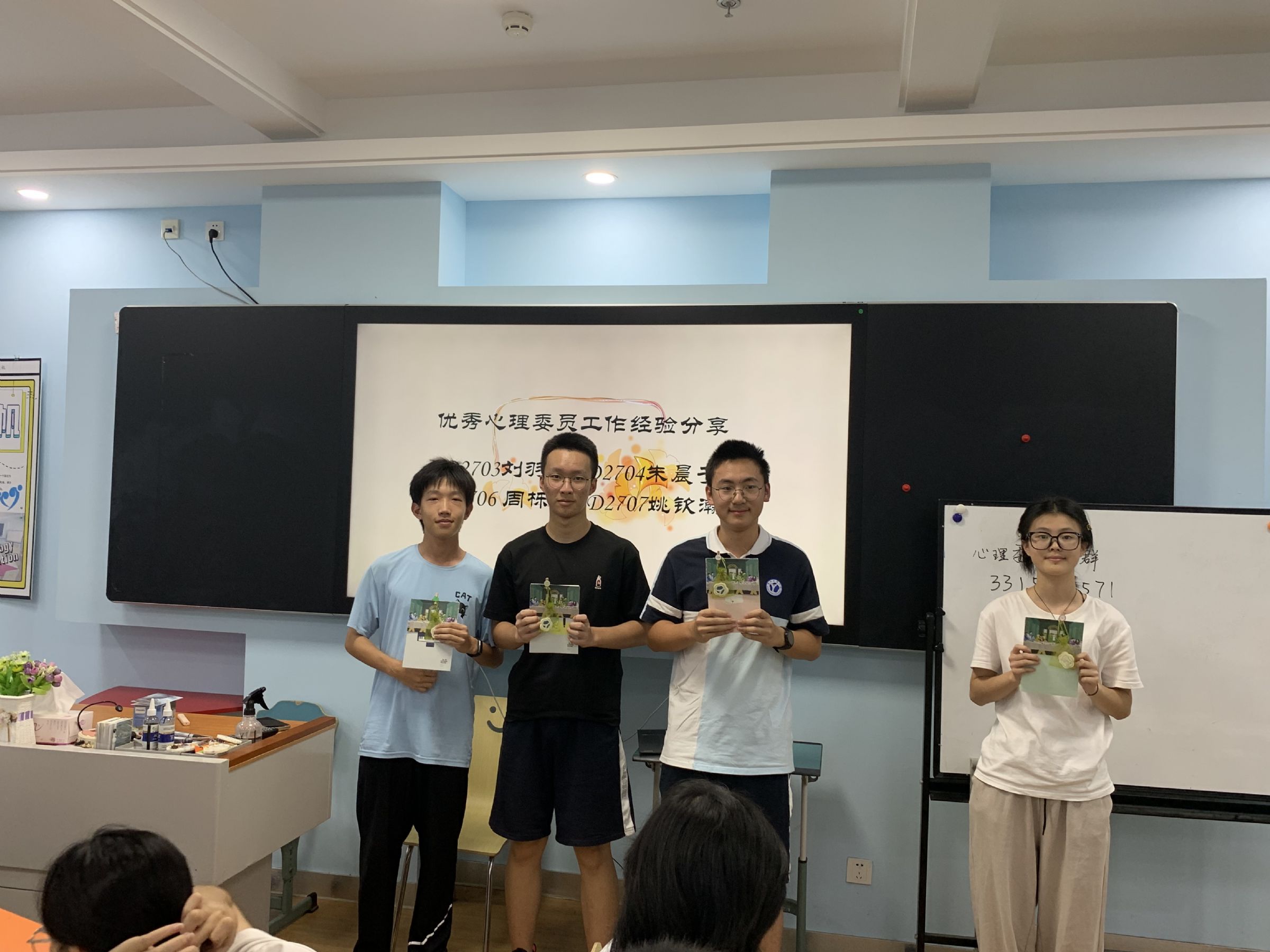 东部校区会上,D2703刘羽洋、D2704朱晨予、D2706周栎冉、D2707姚钦瀚四位优秀心理委员分享了心理委员工作的经验与体会,从心理晴雨表的填写、心理健康宣传活动的组织、心理委员的分工协作、如何有效倾听同学的心声等方面详细介绍了心理委员工作的心得,引发热烈掌声。